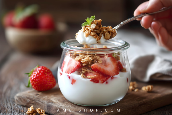 کلاسیک و مقوی : همراه با شیر یا ماست یونانی و کمی عسل.