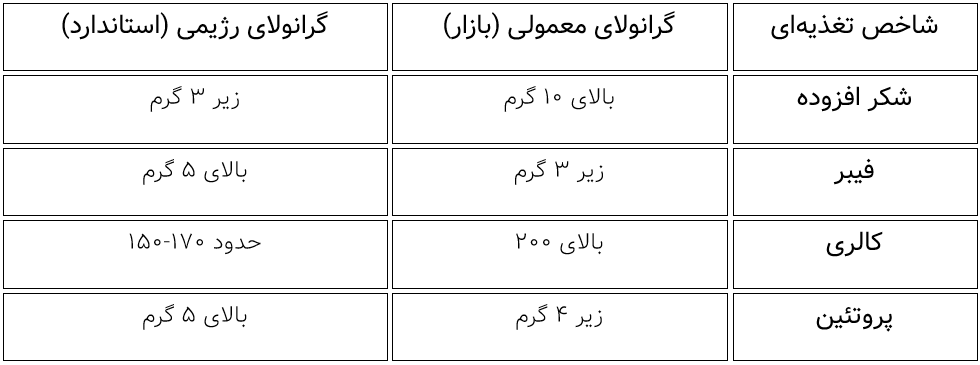 نکته مهم : حجم سروینگ توصیه شده برای گرانولای رژیمی معمولاً بین ۳۰ تا ۵۰ گرم است. استفاده از پیمانه استاندارد برای اندازه گیری و پرهیز از ریختن آزادانه از بسته بندی، تفاوت بین کاهش وزن موفق و شکست در رژیم را ایجاد می کند. به یاد داشته باشید، فلسفه گرانولا برای لاغری بر پایه سیرکنندگی گرانولا بالا و جلوگیری از پرخوری است، نه بر مصرف نامحدود.